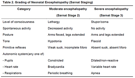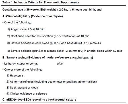 2. Àû¿ë ±âÁØ ±âº»ÀûÀ¸·Î ÁßÁõ ÁÖ»ê±â Áú½ÄÀ¸·Î ÀÎÇÏ¿© ½Å»ý¾Æ°¡ Áߵ ³»Áö´Â ÁßÁõ Àú»ê¼Ò¼º ÇãÇ÷¼º ³úÁõÀ» º¸ÀÎ °æ¿ì¿¡ Àúü¿Â¿ä¹ýÀ» ½ÃÇàÇϵµ·Ï µÇ¾îÀÖ´Ù. ¿ì¼±, Ãâ»ý ½Ã ÀçÅ ¿¬·ÉÀÌ 36ÁÖ ÀÌ»ó, Ãâ»ý üÁßÀº 2.0 kg ÀÌ»óÀ¸·Î¼ »ýÈÄ 6½Ã°£À» °æ°úÇÏÁö ¾Ê¾Æ¾ß ÇÑ´Ù. µ¿½Ã¿¡ ¾Æ·¡ÀÇ ¼¼°¡Áö Á¶°ÇÀ» ¸ðµÎ ¸¸Á·Çϸé Àúü¿Â¿ä¹ýÀÌ Àû¿ëµÈ´Ù(Table 1). ù°, ´ë»ç ÀÌ»óÀÇ Â¡ÈÄÀε¥, (1) Ãâ»ý ÈÄ 10ºÐ¿¡ Apgar Á¡¼ö°¡ 5Á¡ ÀÌÇÏ, (2) »ýÈÄ 10ºÐÀÌ µÇ´Â ½Ã±â±îÁö Àΰø ȯ±â¸¦ µ¿¹ÝÇÑ ¼Ò»ý¼úÀÌ °è¼Ó ÇÊ¿äÇÑ °æ¿ì, (3) Á¦´ëÇ÷ °¡½º ºÐ¼® »ó pH 7.0 ¹Ì¸¸, base deficit 16 mmol/LÀÌ»ó, ȤÀº (4) Á¦´ëÇ÷ °¡½º ºÐ¼® °á°ú¸¦ ¾òÀ» ¼ö ¾ø¾ú´Ù¸é »ýÈÄ 1½Ã°£ À̳»¿¡ äÇ÷ÇÑ Ç÷¾×ÀÇ pH°¡ 7.0 ¹Ì¸¸, base deficitÀÌ 16 mmol/LÀÌ»óÀÎ °æ¿ì Áß ÇѰ¡Áö ÀÌ»óÀÌ ¸¸Á·µÇ¾î¾ß ÇÑ´Ù. µÑ°, ½Å°æÇÐÀû ÀÌ»ó ¼Ò°ß Áï, ³úÁõ(encephalopathy)ÀÇ Â¡ÈÄÀÌ´Ù. ½Å°æÇÐÀû °ËÁø »ó ½Å»ý¾Æ´Â ÀÇ½Ä ÀúÇÏ, È¥¼ö µî ÀǽÄÀÇ º¯È¿Í ÇÔ²² ±Ù ±äÀåµµÀÇ ÀÌ»ó, Moro ¹Ý»ç, ÆÄ¾Ç ¹Ý»ç, oculomotor ¹Ý»ç, µ¿°ø ¹Ý»ç µî ¹Ý»çÀÇ ÀÌ»ó, »¡±â(suck) ÀÌ»ó Áß ÇѰ¡Áö ȤÀº µÎ°¡Áö ÀÌ»óÀ» º¸¿©¾ß ÇÑ´Ù. Áï, Sarnat stage II~III¿¡ ÇØ´çµÇ´Â ÀÓ»ó ¼Ò°ßÀ» º¸ÀδÙ(Table 2). ¼Â°, ÀÓ»óÀûÀ¸·Î °æ·ÃÀÌ Àְųª ³úÆÄ »ó ÀÌ»ó ¼Ò°ßÀÌ ÀÖ´Â °æ¿ìÀÌ´Ù. ³úÆÄÀÇ ÀÌ»óÀº aEEG(amplitude-integrated electroencephalogram) ȤÀº standard EEG(video-EEG Æ÷ÇÔ)·Î Æò°¡ÇÑ´Ù. ƯÈ÷ aEEG »óÀÇ background patternÀº ÁÖ»ê±â Áú½Ä¿¡ ÀÇÇÑ ½Å»ý¾Æ ³úÁõÀÇ ÁßÁõµµ, ½Å°æÇÐÀû ¿¹ÈĿ͵µ »ó°ü¼ºÀÌ ÀÖ´Ù. standard EEG¿¡ ºñÇÏ¿© ȯÀÚ¿¡°Ô ½±°Ô Àû¿ëÇÒ ¼ö ÀÖ°í, °á°ú ÆÇµ¶ÀÌ ¿ëÀÌÇÑ aEEG´Â ½Å»ý¾Æ ÁýÁßÄ¡·á½Ç¿¡¼ÀÇ È°¿ëµµ°¡ ¸Å¿ì ³ô¾Æ ³Î¸® ÀÌ¿ëµÇ°í ÀÖÀ¸¸ç, ÃÖ±Ù¿¡´Â aEEG ÀÌ»ó ¼Ò°ßÀ» ½Å»ý¾Æ Àúü¿Â ¿ä¹ýÀÇ Àû¿ë ±âÁØ¿¡ ¹Ýµå½Ã Æ÷ÇÔ½ÃŰ´Â Àúü¿ÂÄ¡·á ¼¾ÅͰ¡ Áõ°¡Çϰí ÀÖ´Ù.