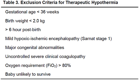 3. ±Ý±â »çÇ× ÀçÅ ¿¬·É 36ÁÖ ¹Ì¸¸, Ãâ»ý üÁß 2.0 kg ¹Ì¸¸, Ãâ»ý ÈÄ 6½Ã°£ ÀÌ»ó °æ°úµÈ ½Å»ý¾Æ, °æÁõ ½Å»ý¾Æ ³úÁõ (Sarnat stage 1), ÁßÁõ ¼±Ãµ¼º ÀÌ»ó, Á¶ÀýµÇÁö ¾Ê´Â ÁßÁõ Ç÷¾×ÀÀ°í Àå¾Ö, 80% ÀÌ»óÀÇ ÈíÀÔ »ê¼Ò³óµµ(FiO2)°¡ ÇÊ¿äÇÑ Áö¼Ó¼º Æóµ¿¸Æ °íÇ÷¾Ð µîÀÇ ÁßÁõ È£ÈíºÎÀü, »ýÁ¸ÇÒ °¡´É¼ºÀÌ ¾ø´Â ½Å»ý¾Æ¿¡°Ô´Â Àúü¿Â¿ä¹ýÀ» ½ÃÇàÇÏÁö ¾Ê´Â´Ù(Table 3).
