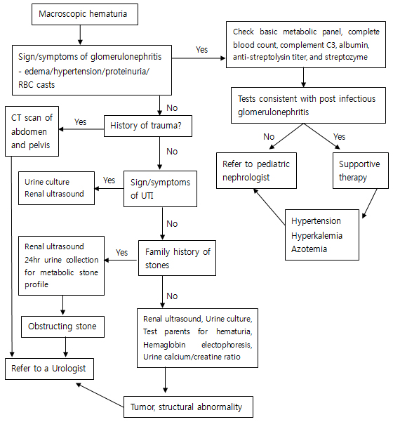 3. Áø´Ü ¹× óġ 1) À°¾ÈÀû Ç÷´¢ À°¾ÈÀû Ç÷´¢°¡ ÀÖ´Â °æÀ¯¿¡ ÀÏ´Ü ÀÚ¼¼ÇÑ º´·Â ûÃë¿Í ÀÌÇÐÀû °Ë»ç¸¦ ½ÃÇàÇÑ´Ù. ƯÈ÷ ÃÖ±Ù¿¡ ½ÉÇÑ ¿îµ¿ ¶Ç´Â ¿Ü»ó ¿©ºÎ, ¿ä½Ç±Ý, ¹è´¢°ï¶õ, ºó´¢, ±Þ¹Ú´¢, ¿·±¸¸® ÅëÁõ, °í¿, µµ´¢ Áß¿¡ Ç÷´¢°¡ ³ª¿À´Â ½Ã°£, ¼Òº¯ÀÇ »ö, ÀÎÈÄ¿°, ³ó°¡Áø, °¡Á··Â, ¾à¹° º¹¿ë·Â µîÀ» ¹°¾îºÁ¾ß Çϰí, ÀÌÇÐÀû °Ë»ç·Î Ç÷¾Ð°ú ºÎÁ¾ÀÇ È®ÀÎ, ÀÚ¹ÝÀ̳ª ¹ßÁø ¿©ºÎ, ¼º±âÀÇ ½ÃÁø°ú º¹ºÎ Á¾±« ÃËÁøÀÌ ÇÊ¿äÇÏ´Ù. ´ÙÀ½À¸·Î Ç¥ 2 ¿¡¼¿Í °°ÀÌ ¼Òº¯°Ë»ç¸¦ ÅëÇØ RBC cast, morphology of RBC (±×¸² 1), signifiacnt proteinuria, three tube test, color, clot in urine µîÀ» È®ÀÎÇÔÀ¸·Î½á »ç±¸Ã¼¼º Ç÷´¢¿Í ºñ»ç±¸Ã¼¼º Ç÷´¢¸¦ ±¸º°ÇÒ ¼ö ÀÖ´Ù. À°¾ÈÀû Ç÷´¢°¡ ÀÖÀ» °æ¿ì Áø´ÜÀÇ algorithm Àº Ç¥ 3°ú °°´Ù.