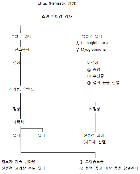 2. ºÐ·ù Ç÷´¢ÀÇ ¿øÀÎÀ¸·Î´Â »ç±¸Ã¼¼º °ú ºñ»ç±¸Ã¼¼ºÀ¸·Î ³ª´µ¾î Áö´Âµ¥, ºñ»ç±¸Ã¼¼ºÀº °£Áú¼º, Ç÷°ü¼º, ¿ä·Î°è ·Î ³ª´ ¼ö ÀÖ´Ù. »ç±¸Ã¼¼º¿¡´Â IgA ½ÅÁõ, ¹Ú±âÀú¸· Áúȯ (Thin basement membrane disease), ¿¬¼â±¸±Õ°¨¿°ÈÄ »ç±¸Ã¼½Å¿° (Poststreptococcal acute glomerulonephritis), ¸·Áõ½Ä¼º »ç±¸Ã¼½Å¿° (Membranoproliferative glomerulonephritis), Çì³ëÈå¼é¶óÀÎ ½Å¿° (Henoch-Schonlein nephritis), ¾ËÆ÷Æ® ÁõÈıº (Alport syndrome), ¿ëÇ÷¼º ¿äµ¶ ÁõÈıº (Hemolytic uremic syndrome), ³¶Ã¢¼º ½Å¿° (Lupus nephritis) µîÀÌ ÀÖ°í, ºñ»ç±¸Ã¼¼ºÀº ¿ä·Î°è°¨¿° (UTI), °íÄ®½·´¢ (Hypercalciuria), °£Áú¼º ½Å¿° (Interstitial nephritis), ¼±Ãµ¼º ±âÇü (Congenital anomaly), ¿Ü»ó (Trauma), Ç÷°ü ±âÇü (Vascular anomaly), ½ÅÁ¤¸Æ Ç÷ÀüÁõ (Renal vein thrombosis), ³ÊƮũ·¢ ÁõÈıº (Nutcracker syndrome), Á¾¾ç (Tumor), ÃâÇ÷ Áúȯ (Bleeding disorder) µîÀÌ ÀÖ´Ù. ½ÅÁúȯÀÌ ¾Æ´Ñ Ç÷´¢ÀÇ ´Ù¸¥ ¿øÀÎÀ¸·Î´Â Ç÷¾× Áúȯ (¹éÇ÷º´, ITP, Àç»ýºÒ·®¼º ºóÇ÷, Ç÷¿ìº´), ¾à¹° º¹¿ë (NSAIDs, Sulfa °è, salicylate, methyldopa, kanamycin, methicillin, cephalosporin, bacitracin, PAS), ½ÉÇÑ ¿îµ¿ ¶Ç´Â ¿Ü»ó µîÀÌ ÀÖ´Ù.