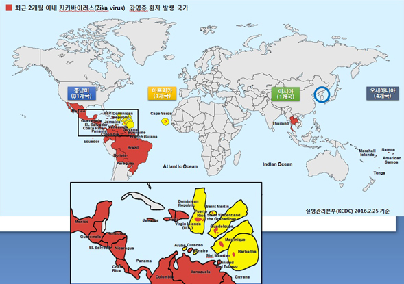2016³â ÃʺÎÅÍ ÁöÄ«¹ÙÀÌ·¯½º °¨¿° È®»ê¿¡ ´ëÇÑ ¼Ò½ÄÀ¸·Î Àü¼¼°è°¡ ±äÀåÇϰí ÀÖ´Ù. ÀÌ¿¡, ¿ì¸®³ª¶ó ¼Ò¾Æ°úû¼Ò³â°ú ÀÇ»çµéÀÌ ¾Ë¾Æ¾ß ÇÒ ÁöÄ«¹ÙÀÌ·¯½º¿¡ ´ëÇÑ ÃֽŠÁö°ßÀ» °øÀ¯ÇϰíÀÚ ÇÑ´Ù. ÁöÄ«¹ÙÀÌ·¯½º´Â µ±â¹ÙÀÌ·¯½º, ÀϺ»³ú¿°¹ÙÀÌ·¯½º¿Í °°Àº Flavivirus°è¿À̸ç, ÁÖ·Î °¨¿°µÈ ½£¸ð±â(Aedes spp.)¿¡ ¹°·Á ÀüÆÄµÇ´Âµ¥, ÇöÀç ÅÂÆò¾ç°ú Áß³²¹Ì¿¡¼´Â ÀÌÁýÆ®½£¸ð±â(Aedes aegypti)¿¡ ÀÇÇØ ÀüÆÄµÇ°í ÀÖÀ¸³ª, ±¹³»¿¡¼ ¼½ÄÇÏ´Â ÈòÁÙ½£¸ð±â(Aedes albopictus)¿¡ ÀÇÇØ¼µµ ÀüÆÄ°¡ °¡´ÉÇÑ °ÍÀ¸·Î ÃßÁ¤µÈ´Ù. ÇöÀç·Î¼± ¼±Ãµ°¨¿° ½Ã žƿ¡°Ô °¡Àå Å« ¹®Á¦°¡ µÉ ¼ö ÀÖÀ¸¹Ç·Î, ƯÈ÷ ÀӽźεéÀº À¯ÇàÁö¿ªÀ¸·ÎÀÇ ¿©ÇàÀ» »ï°¡µµ·Ï Çϰí ÀÖ´Ù. 2016³â 3¿ù 1ÀÏ ±âÁØÀ¸·Î ÃÖ±Ù 2°³¿ù À̳»¿¡ ÁöÄ«¹ÙÀÌ·¯½º °¨¿°ÁõÀÌ ¹ß»ýÇÑ ±¹°¡´Â ÃÑ 37°³±¹À̸ç, Áß³²¹Ì 31°³±¹°ú ÅÂÆò¾çÀÇ Åë°¡, ¹Ì±¹·É »ç¸ð¾Æ, »ç¸ð¾Æ ¼¶, ¸¶¼ÈÁ¦µµ, ¾Æ½Ã¾ÆÀÇ Å±¹, ¾ÆÇÁ¸®Ä«ÀÇ Ä«º¸º£¸£µ¥ÀÌ´Ù(±×¸²1). Áúº´°ü¸®º»ºÎ ȨÆäÀÌÁö(www.cdc.go.kr) ¹× ÇØ¿Ü¿©ÇàÁúº´Á¤º¸¼¾ÅÍ(travelinfo.cdc.go.kr)¿¡¼ °ü·Ã Á¤º¸¸¦ Áö¼ÓÀûÀ¸·Î ¾÷µ¥ÀÌÆ® ÁßÀÌ´Ù.