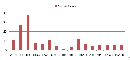 ±×¸² 1. ÃÖ±Ù 15³â°£ ±¹³»¿¡¼ ¹ß»ýÇÑ ¼ö¸·±¸±Õ ¼ö¸·¿° ¿¬µµº° ºÐÆ÷ (2001³â 1¿ù ~ 2016³â 12¿ù) (Ãâó: http://is.cdc.go.kr/dstat/jsp/stat/stat0002.jsp)