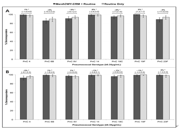 ¼ö¸·±¸±Õ ´Ü¹é°áÇÕ ¹é½Å°ú Æó±¸±Õ ´Ü¹é°áÇÕ ¹é½ÅÀÇ ¸é¿ª °£¼· ¹ÝÀÀ MCV-4¿Í ´Ù¸¥ ¹é½ÅÀ» µ¿½Ã¿¡ Á¢Á¾ÇÒ ¼ö ÀÖ´Ù. ÇÏÁö¸¸ MCV-4¿Í Æó±¸±Õ ´Ü¹é°áÇÕ ¹é½Å(pneumococcal conjugate vaccine; PCV)À» µ¿½ÃÁ¢Á¾ ÇÒ ¶§´Â ´ÙÀ½°ú °°Àº ¸é¿ª°£¼·(interference) Çö»óÀÌ ÀÖÀ» ¼ö ÀÖ´Ù. Áï, »ýÈÄ 2, 4, 6°³¿ù ¹× 12°³¿ù¿¡ ÃÑ 4ȸ Á¢Á¾À¸·Î Menveo ¹× PCV7À» µ¿½Ã¿¡ Á¢Á¾½Ã 3Â÷ Á¢Á¾ ÈÄ 1°³¿ù°ÀÎ »ýÈÄ 7°³¿ù¿¡´Â Æó±¸±Õ Ç÷ûÇü 6B ¹× 23F¿¡ ´ëÇÑ ¸é¿ª°£¼· Çö»óÀÌ ¹ß»ýÇÏÁö¸¸, »ýÈÄ 12°³¿ù¿¡ Á¢Á¾ ÈÄ¿¡´Â 6B ¹× 23F¿¡ ´ëÇÑ ¸é¿ª°£¼· Çö»óÀº °üÂûµÇÁö ¾Ê¾Ò´Ù. ÀÌ¿¡ Menveo´Â PCV¿ÍÀÇ µ¿½Ã Á¢Á¾¿¡´Â Á¦ÇÑÀÌ ¾ø°Ô Çã°¡°¡ µÇ¾ú´Ù (±×¸² 2).