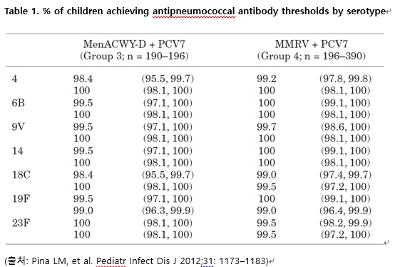 ÇÑÆí MenactraÀÇ °æ¿ì 2Â÷ Á¢Á¾À» »ýÈÄ 12°³¿ù¿¡ PCV7 4Â÷¿Í µ¿½Ã Á¢Á¾ÇÏ´Â °æ¿ì PCV7 ´Üµ¶ Á¢Á¾¿¡ ºñÇØ Æó±¸±Õ Ç÷ûÇü 4, 6B ¹× 18C¿¡ ´ëÇÑ Ç×ü°¡°¡ ³·¾Æ ºñ¿µî¼º ±âÁØÀ» ¸¸Á·ÇÏÁö ¸øÇÏ¿´´Ù. ÇÏÁö¸¸, ÀÌ °æ¿ì¿¡µµ opsonophagocytic response ¹× IgG Ç×ü Çü¼ºÀº 7°³ÀÇ Æó±¸±Õ ¹é½Å Ç÷ûÇü¿¡ ´ëÇØ¼ ¸í¹éÈ÷ °üÂûµÇ¾ú´Ù (Table 1).