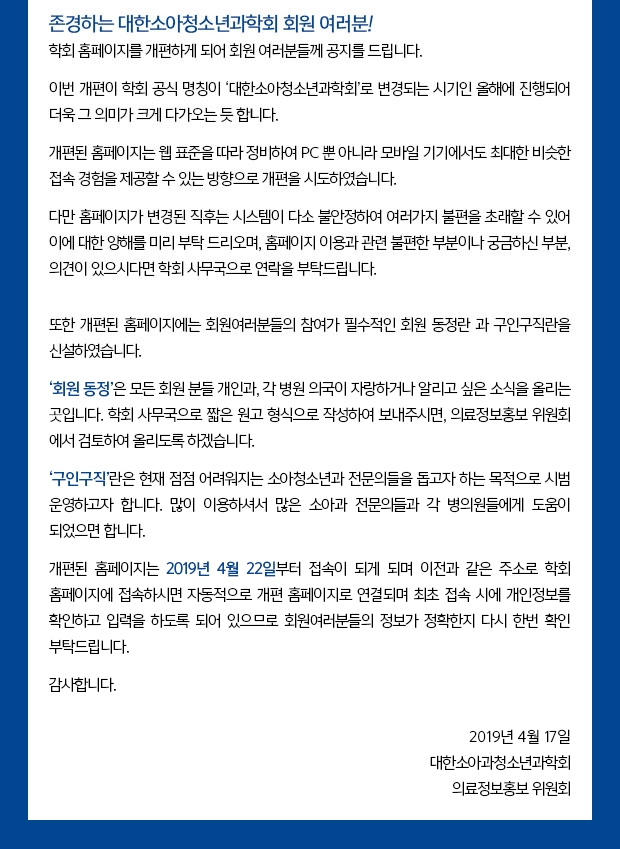 [´ëÇѼҾÆÃ»¼Ò³â°úÇÐȸ] ȨÆäÀÌÁö °³Æí °ü·Ã ¾È³»¹®